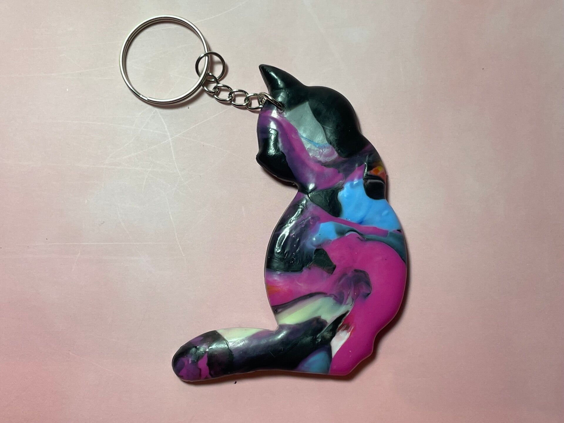 Deze sleutelhangers zijn vervaardigd uit te recycleren plastic. Dit word gesmoten in een platte schijf en dan een figuur uitgesneden.